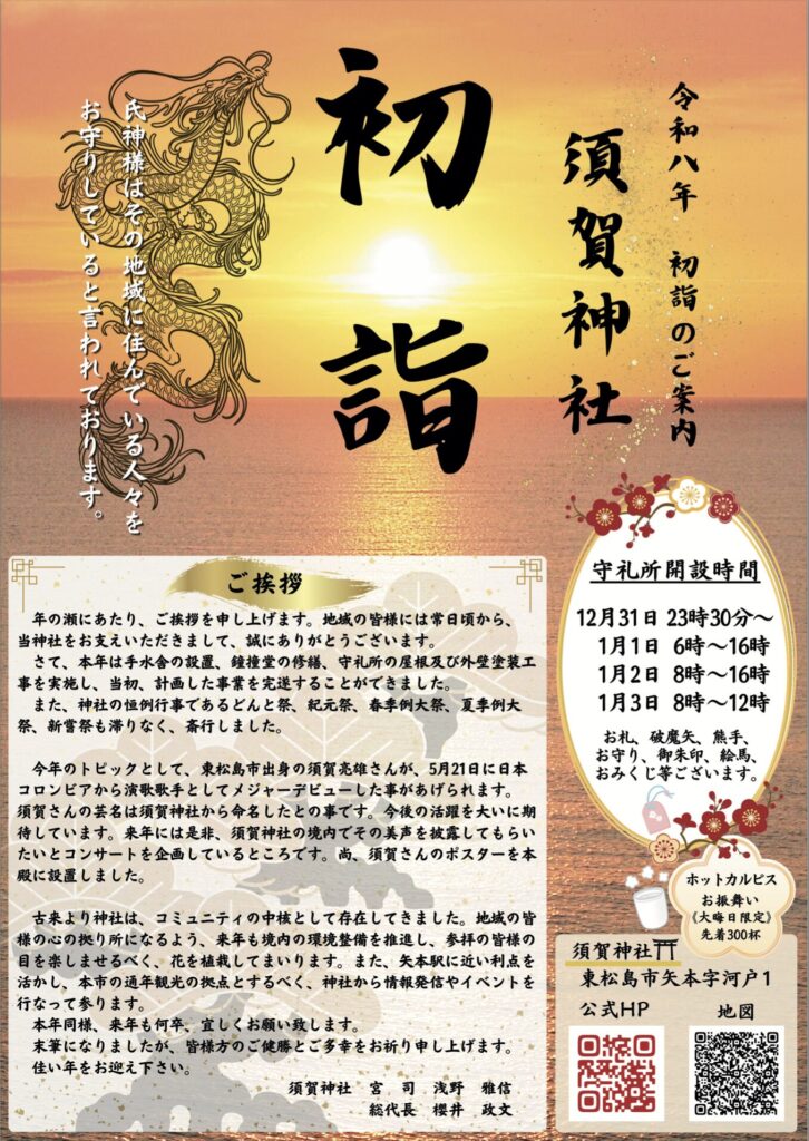 来 年 に は 是 非 、 須 賀 神 社 の 境 内 で そ の 美 声 を 披 露 し て も ら いた い と コ ン サ ー ト を 企 画 し て い る と こ ろ で す 。 尚 、 須 賀 さ ん の ポ ス タ ー を 本殿 に 設 置 し ま し た 。
